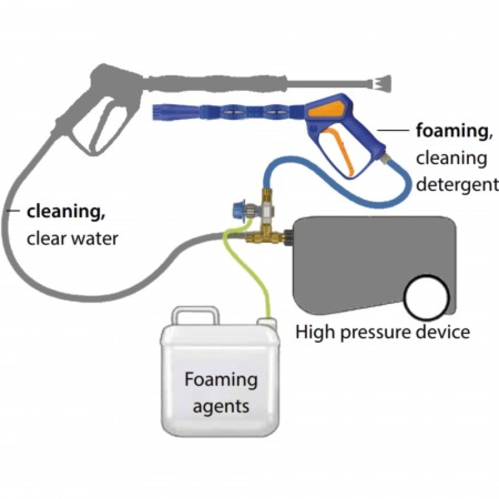 De roestvrijstalen injector met hogedruk schuimlans die via een T-stuk tussen de uitlaat van de hogedrukunit en de originele spuiteenheid is geïnstalleerd, is speciaal ontworpen voor het professioneel reinigen van vrachtwagens, scheepvaart- of levensmiddelenbedrijven en voor toepassingen in de industriële schuimreiniging.