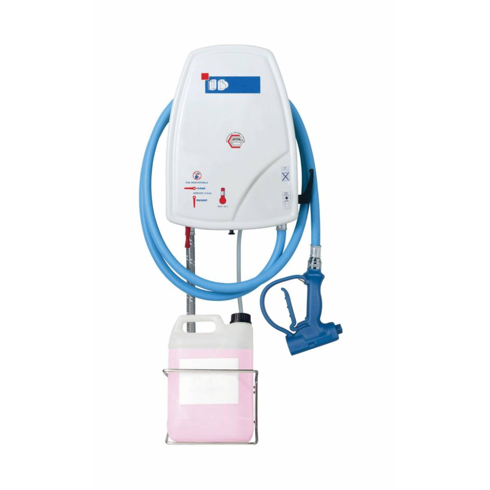 Word aangesloten op een watertoevoer en verdunt automatisch het reinigingsproduct met water.